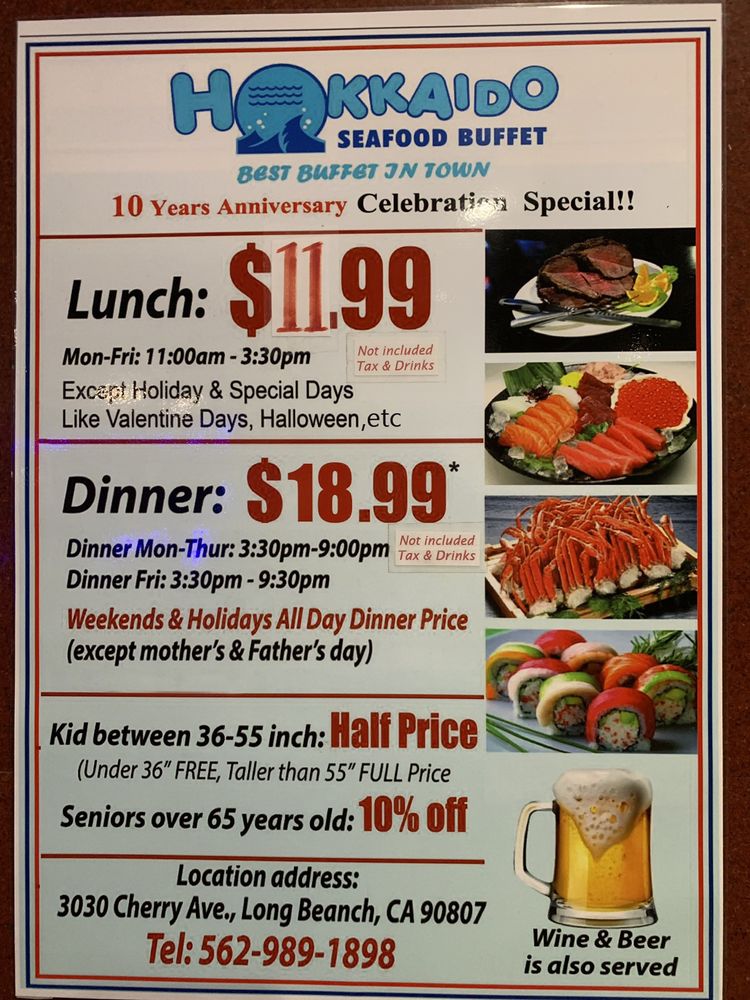 At Hokkaido Seafood Buffet, located in Long Beach, CA, you can experience a wide range of dining options. From sushi and sashimi selections like Tuna and Salmon Sushi to appetizers like Fried Banana and Cheese Wonton, there's something for everyone. The restaurant offers vegan and vegetarian options, along with a variety of side dishes including Steamed Rice and Chow Mein. Customers have praised the excellent customer service and diverse menu offerings, with traditional buffet items alongside specialty dishes. With options for delivery, takeout, and catering, Hokkaido Seafood Buffet caters to a variety of dining preferences. The restaurant also provides a comfortable dining environment with amenities like free Wi-Fi, a full bar, and outdoor seating. Overall, Hokkaido Seafood Buffet offers a satisfying dining experience for customers of all ages.